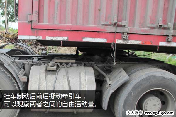 兩人配合,一個(gè)人駕駛牽引車向前、向后反復(fù)活動(dòng)幾次,另一個(gè)人在旁邊觀察牽引盤和掛車是否有相對的間隙,如果有很容易就能觀察的到。