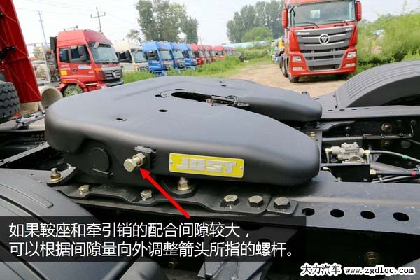 如果斷定牽引鞍座相對掛車有較大的間隙那該怎么辦呢?不用著急,這個(gè)毛病一般都很好處理,牽引鞍座左側(cè)有一個(gè)可以調(diào)整的螺桿,但一般人都不知道它是干什么用的,其實(shí)它就是調(diào)節(jié)牽引鞍座工作間隙的裝置,向內(nèi)擰螺桿間隙變大,向外擰間隙變小,大家可以根據(jù)自己車輛牽引盤的間隙進(jìn)行適當(dāng)?shù)恼{(diào)整,但要千萬記住調(diào)整后鎖緊螺母。如果是牽引盤上下鉸接部分的軸套間隙大了就只能拆解進(jìn)行軸套和軸銷更換維修了,但此類配件一般都比較便宜,維修成本不高。