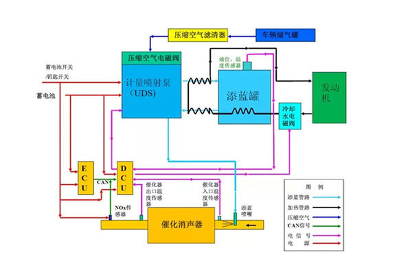 現(xiàn)目前各大商用車企將SCR系統(tǒng)作為一套成熟的技術(shù)應(yīng)用于旗下各大車型之上,該系統(tǒng)采用的是壓縮空氣輔助噴射系統(tǒng),計量噴射泵內(nèi)置控制裝置,可控制內(nèi)部計量泵和壓縮空氣電磁閥按既定的程序工作。