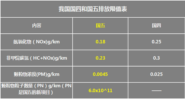 國五排放標(biāo)準(zhǔn)相比國四排放標(biāo)準(zhǔn),氮氧化物(NOx)排放降低了28%,碳?xì)浠衔锖偷趸铮℉C+NOx)總和指標(biāo)降低了23%,而對于柴油車的顆粒物濃度(PM)降低了82%,還有新增的顆粒物粒子數(shù)量(PN)檢測也是沖著柴油車來的,PN標(biāo)準(zhǔn)只對柴油車檢測。
