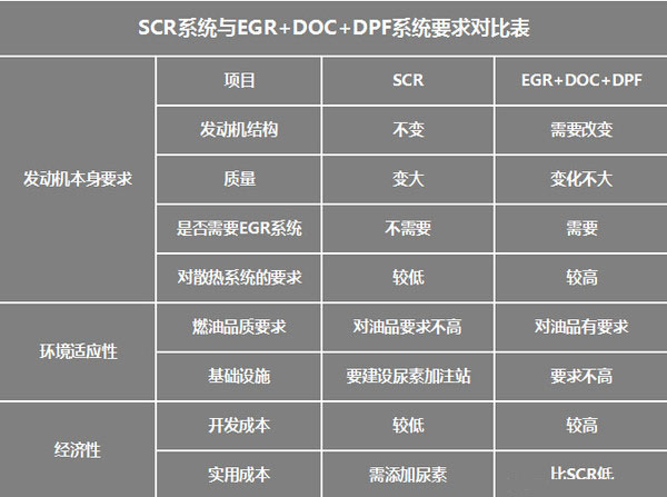 通過對比可發(fā)現(xiàn)SCR燃油經(jīng)濟(jì)性好,發(fā)動(dòng)機(jī)改動(dòng)小,低熱量對冷卻系統(tǒng)無要求,但是,SCR系統(tǒng)箱體處理尺寸和重量大,監(jiān)控系統(tǒng)復(fù)雜,需要增加尿素,時(shí)間長了會產(chǎn)生結(jié)晶,整體成本提升,特別對輕卡來說。