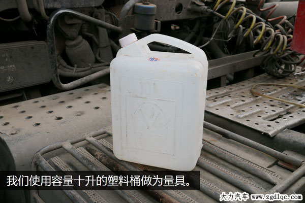 為了更直觀的進行測試,我們選擇了一只容量為10升的塑料油桶作為容器,怠速運行期間的燃料全部儲存在這里,可以把它理解為這輛卡車的一個油箱,只不過容量小一些而已。