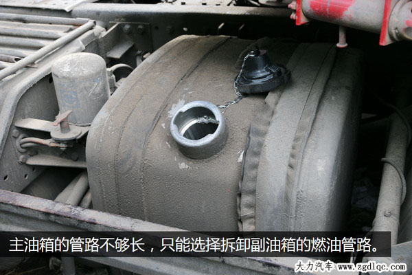 黃師傅的解放J6裝有一大一小兩個油箱,分為在車架的兩側,一開始我們選擇拆卸主油箱的出油和回油管,但是發(fā)現(xiàn)油管的長度不夠長,所以只能選擇拆卸油管相對長一點的副油箱油管來進行測試。