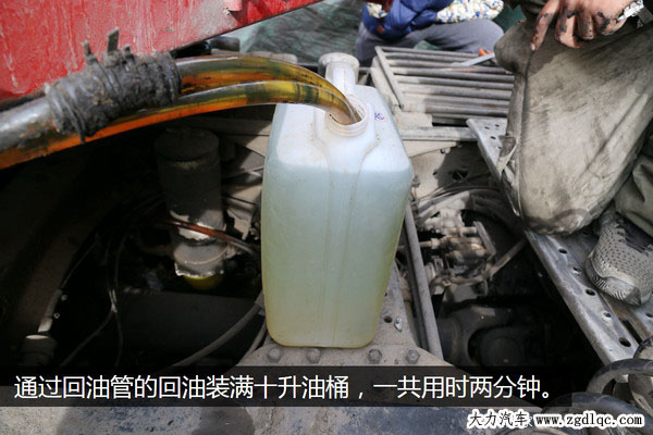 通過回油管取油的速度取決于回油量,所以借著這次機會正好還能對回油量進行一次測試,一舉兩得。經(jīng)過測試,從啟動發(fā)動機到把十升的油桶灌滿,一共用時兩分零五秒,可見電控共軌發(fā)動機的柴油循環(huán)流量非常的大。