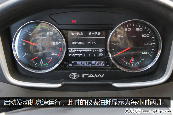 黃師傅的這臺解放J6裝配的是錫柴6DM2電控發(fā)動機,11升排量420馬力,駕駛室內(nèi)的儀表能顯示出發(fā)動機的瞬時油耗,啟動發(fā)動機后發(fā)動機轉速穩(wěn)定在650轉左右,油耗顯示為每小時2升,但是電子儀表都有一些誤差,最終的數(shù)據(jù)還要看我們的實驗結果。