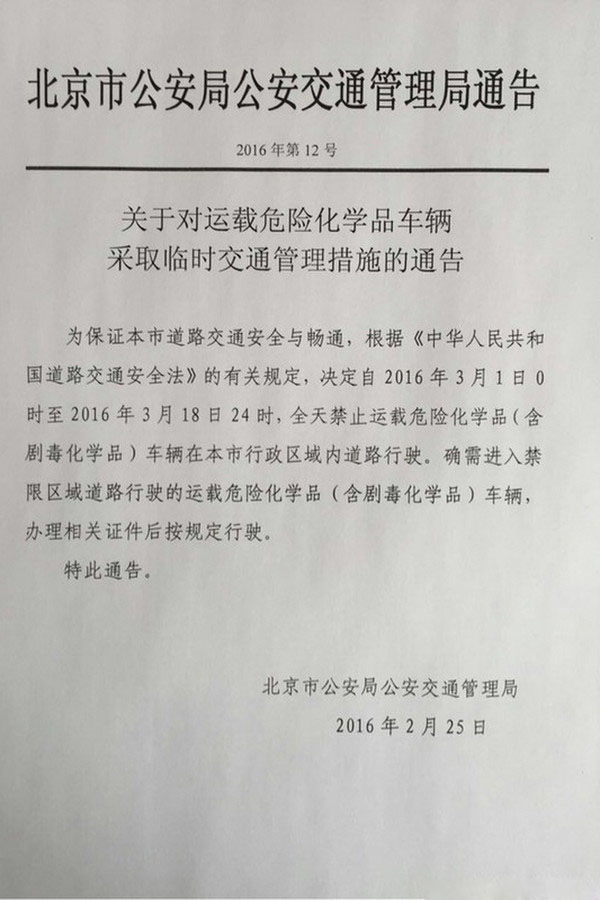 為確!皟蓵逼陂g交通秩序正常穩(wěn)定,保證城市道路交通安全與暢通,北京市決定于2016年3月1日0時至2016年3月18日24時,全天禁止運載危險化學品(含劇毒化學品)車輛資本是行政區(qū)域內道路行駛,確需進入禁限區(qū)域道路行駛的運載危險化學品(含劇毒化學品)車輛,辦理相關證件后按規(guī)定行駛。