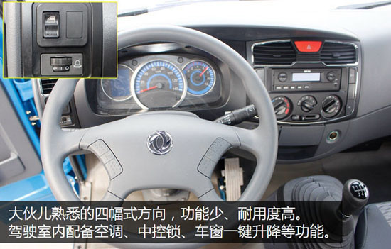 D6延續(xù)了四幅方向盤(pán)的設(shè)計(jì)。室內(nèi)配備空調(diào)、中控鎖、車(chē)窗一鍵升降等功能。國(guó)五升級(jí)增加了大燈角度調(diào)節(jié)功能,實(shí)用性更強(qiáng)。