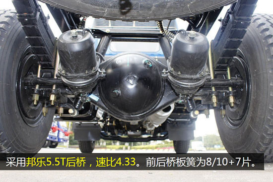 前后橋均采用了多片簧設(shè)計(jì),提升車(chē)輛的承載性能。采用邦樂(lè)5.5噸級(jí)后橋,速比4.33。目前我國(guó)的輕卡產(chǎn)品普遍采用的是3.5噸級(jí)后橋與5噸級(jí)后橋,多利卡D6的5.5噸級(jí)算得上是載重量較高的后橋產(chǎn)品了。