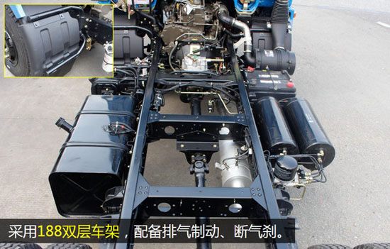 8.25R16LT輪胎與188雙層車(chē)架,和8/10+7前后片簧搭配,這樣的配置在4.2米輕卡里并不多見(jiàn),是目前承載能力最高的多利卡D6。
