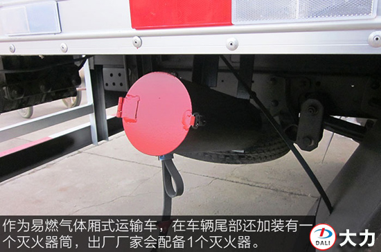 作為易燃?xì)怏w廂式運(yùn)輸車,在車輛尾部還加裝有一個(gè)滅火器筒,出廠廠家會配備1個(gè)滅火器,發(fā)生緊急情況時(shí)可救急使用。