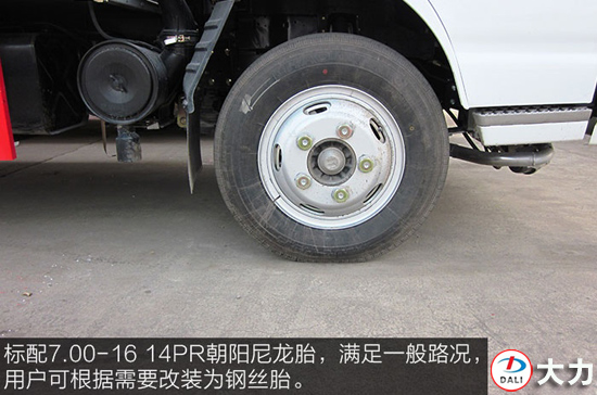 標(biāo)配7.00-16 14PR朝陽尼龍?zhí),滿足一般路況,用戶可根據(jù)需要改裝為鋼絲胎。