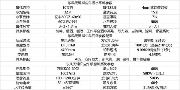 東風(fēng)天錦抑塵車采用東風(fēng)天錦DFL1160BX底盤(pán),康明斯180馬力(選裝210馬力)國(guó)五發(fā)動(dòng)機(jī),東風(fēng)6檔變速箱,軸距4700mm,9噸后橋,9.00R20原廠鋼絲胎,排半帶臥可前翻駕駛室,原廠abs,原廠空調(diào),帶方向助力,離合助力器,氣剎制動(dòng)。