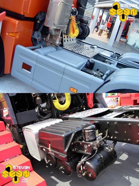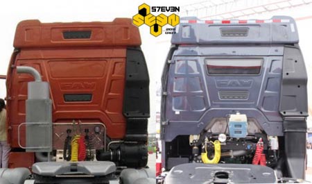 從后面看,J6HC的空濾雖然沒(méi)有布置在底盤里或者駕駛室下方,但總體結(jié)構(gòu)比較緊湊。但是J6H不但駕駛室打了補(bǔ)丁,進(jìn)氣管也打了補(bǔ)丁,硬生生的加長(zhǎng)了一截,看起來(lái)很怪異。另外膨脹水箱也沒(méi)有收納起來(lái),而是外露在駕駛室后圍上,讓人感覺(jué)十分遺憾。