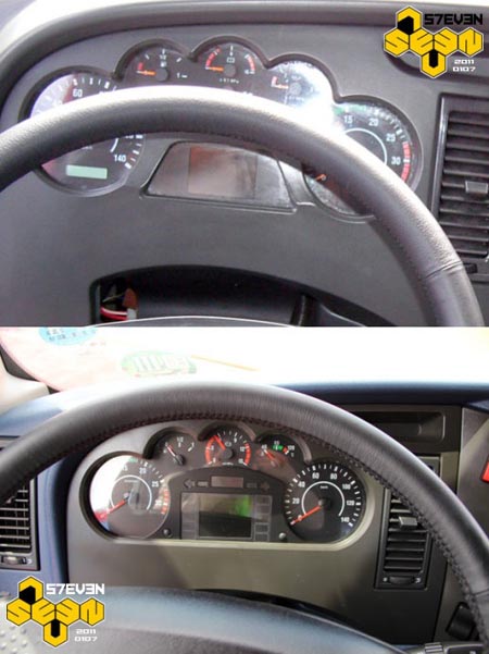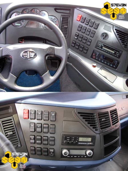 J6HC當(dāng)年的儀表臺(tái)是樣件,甚至沒(méi)有開(kāi)皮紋。J6H采用與J6P一樣的儀表臺(tái),雖然套色的結(jié)構(gòu)拜托了中國(guó)重卡惡俗的仿桃木習(xí)慣,但藍(lán)灰的顏色搭配可能并不是最好的選擇吧。