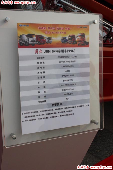 在2011年商務(wù)年會(huì)上,解放展示了作為即將在2011年量產(chǎn)的平地板J6,配置與2010年北京車展上的J6P平地板牽引車相同。而這次的命名,既不是“J6升級(jí)版”,也不是“J6P平地板”,而是回歸了他本來(lái)的名字“J6H”!