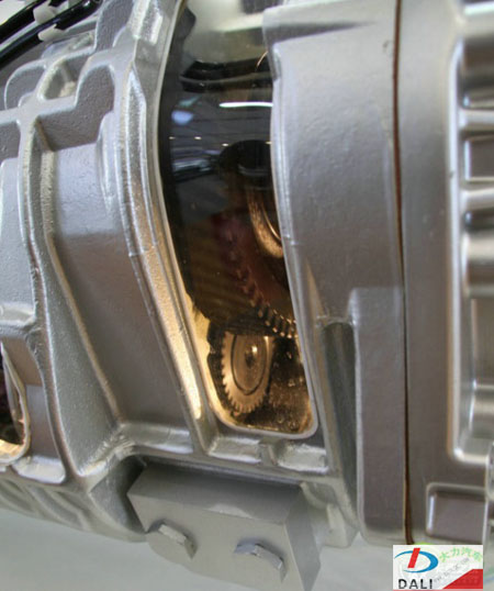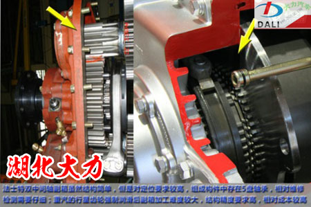 從結(jié)構(gòu)上看,法士特的雙中間軸變速箱基本上還是延續(xù)美國(guó)EATON的設(shè)計(jì)思路,但是在大扭矩變速箱上不裝強(qiáng)制潤(rùn)滑油泵,尤其長(zhǎng)時(shí)間爬坡以及高速重載下坡的情況下,在副箱上存在一定的不穩(wěn)定因素;可喜的是我們?cè)诒本┸囌股峡吹搅祟愃朴捅玫脑O(shè)計(jì),只不過(guò)并沒(méi)有運(yùn)用在這次展出的AMT變速箱中,從驅(qū)動(dòng)形式上看,此種比較像后副箱驅(qū)動(dòng)類型。