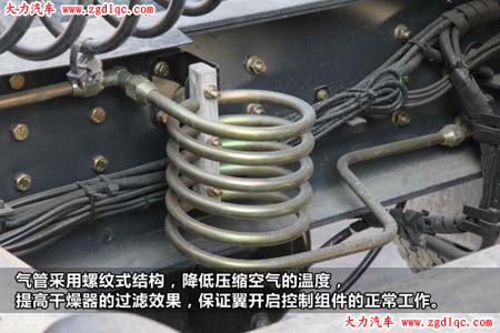 除了顏色,車身配置與之前常見的天龍沒有太大的差別,在大梁內(nèi)小編看到這么一個(gè)螺紋式氣管結(jié)構(gòu),這種結(jié)構(gòu)可以降低壓縮空氣的溫度,提高干燥器的過(guò)濾效果,保證翼開啟控制組件的正常工作,天龍系列車型已經(jīng)開始推廣此項(xiàng)改進(jìn)。