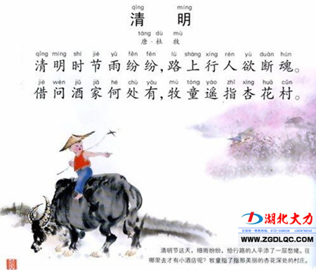 清明,農(nóng)歷二十四節(jié)氣之一。中國(guó)傳統(tǒng)的清明節(jié)大約始于周代,距今已有二千五百多年的歷史!稓v書》:“春分后十五日,斗指丁,為清明,時(shí)萬物皆潔齊而清明,蓋時(shí)當(dāng)氣清景明,萬物皆顯,因此得名!鼻迕饕坏,氣溫升高,正是春耕春種的大好時(shí)節(jié),故有“清明前后,種瓜種豆”。清明節(jié)是一個(gè)祭祀祖先的節(jié)日,主要是掃墓,掃墓是慎終追遠(yuǎn)、敦親睦族及行孝的具體表現(xiàn)。清明節(jié)是在仲春與暮春之交,也就是冬至后的106天。2006年5月20日,該民俗節(jié)日經(jīng)國(guó)務(wù)院批準(zhǔn)列入第一批國(guó)家級(jí)非物質(zhì)文化遺產(chǎn)名錄。另,詠清明詩極多,杜牧《清明》詩最為著名。