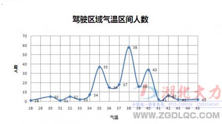 此圖為參與調(diào)查的卡友們所處在的駕駛環(huán)境的氣溫區(qū)間圖,調(diào)查顯示卡友們的駕駛環(huán)境基本在35—40攝氏度,最高氣溫為45攝氏度。該項調(diào)查證明大多數(shù)卡車司機的駕駛環(huán)境已經(jīng)超出了人體感受的舒適度。