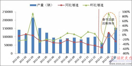 從第一季度各月份增長情況來看,與往年相比,一季度各月份比例存在著較大不同,其主要原因歸結(jié)如下:往年春節(jié)均在2月份,而今年的春節(jié)提前11天至1月,使得原本2月份產(chǎn)銷量均較低的情況提前至1月;元旦假期是另一個(gè)主要原因,1月工作日僅有17天,使得今年1月份的產(chǎn)量同比、環(huán)比增幅均呈現(xiàn)出較大幅度下降;相比之下,2月份由于工作日較往年多,同比、環(huán)比均呈現(xiàn)出較大幅度的增長。圖1為2011年以來專用汽車的月度走勢圖。