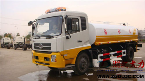 湖北大力汽車公司生產(chǎn)的東風天錦灑水車垂直吸程可達到7米以上,灑水寬度≧14-16米,可噴射28-30米以上,揚程90米。引水時間小于5min,流量90m3/h。罐體可以選橢圓形或方形,倉內1.5米一道隔板,起到防波防蕩的效果。用戶還可以選擇對罐體進行專業(yè)的防腐防銹處理,另外還配備多方位進出水接頭、氣動閥、警燈等先進設施,操作簡單、使用方便。