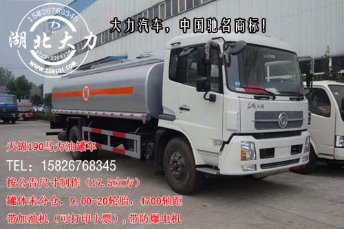 車輛配置 采用東風(fēng)集團(tuán)原裝底盤生產(chǎn),排半可前翻駕駛室,大同6檔變速箱,4.5噸前橋9噸后橋,采用9.00-20尼龍?zhí)ヌゲ捎?50×80MM直通車架,配置康明斯190馬力發(fā)動(dòng)機(jī),發(fā)動(dòng)機(jī)型號(hào):B190 33. 豪華駕駛室,斷氣剎/排氣制動(dòng)/動(dòng)力轉(zhuǎn)向.配備標(biāo)準(zhǔn)加油機(jī)一臺(tái),帶15米卷盤和槍,配置專用油泵,具有快速的進(jìn)油或出油功能。隨車附帶2根罐體等長(zhǎng)的油管,2個(gè)滅火器,1個(gè)爬梯,兩側(cè)及后保險(xiǎn)杠,1根接地線。罐體最大容積17.5立方米(15噸柴油)。