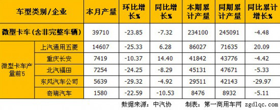 6月份微型卡車(含非完整車輛)銷量前5的企業(yè)依次為:上汽通用五菱(16259輛)、重慶長(zhǎng)安(6895輛)、北汽福田(6466輛)、東風(fēng)汽車公司(5880輛)和奇瑞汽車(1178輛),5家合計(jì)銷售36678輛,占微型卡車(含非完整車輛)總銷量38919輛的94.24%。