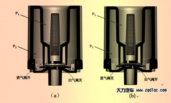 當空氣干燥器的卸荷閥打開后,將使空壓機到干燥器之間的氣壓降低,排氣閥膜片打開,如圖(b),油水混合物及雜質通過排氣閥排入大氣或流入外置收集筒中,當油水分離器收集器(p2)中的壓力降低到一定水平后,膜片關閉。