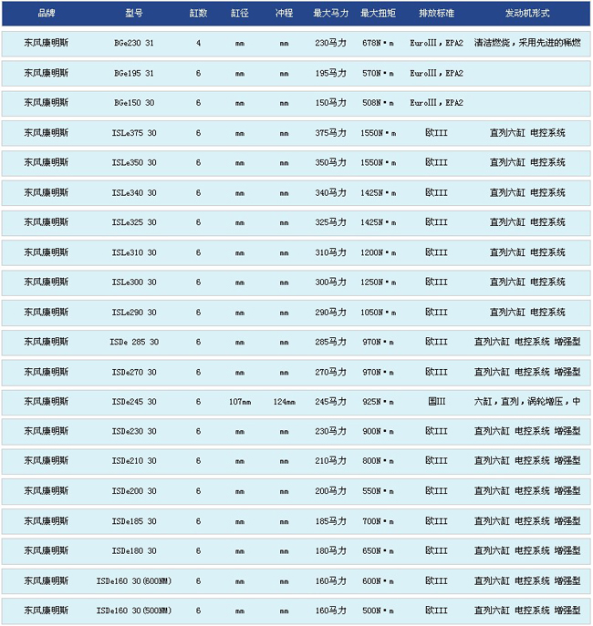東風(fēng)康明斯發(fā)動(dòng)機(jī)部分型號圖表